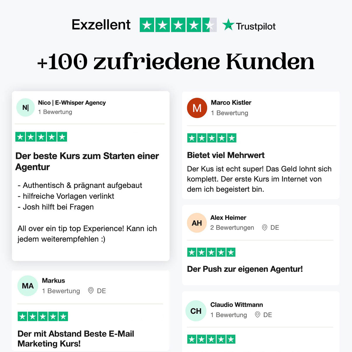 Alle anderen Tools, die ich in meiner Agentur benutze und die du auch in meinem Kurs kennenlernst, gibt es in Gratis-Versionen. Diese kostenlosen Versionen reichen völlig aus, um deine ersten drei bis fünf Kunden zu betreuen. Mehr brauchst du am Anfang gar nicht – denn mit nur drei bis fünf Kunden kannst du bereits mehr verdienen, als in einem klassischen Angestelltenverhältnis.