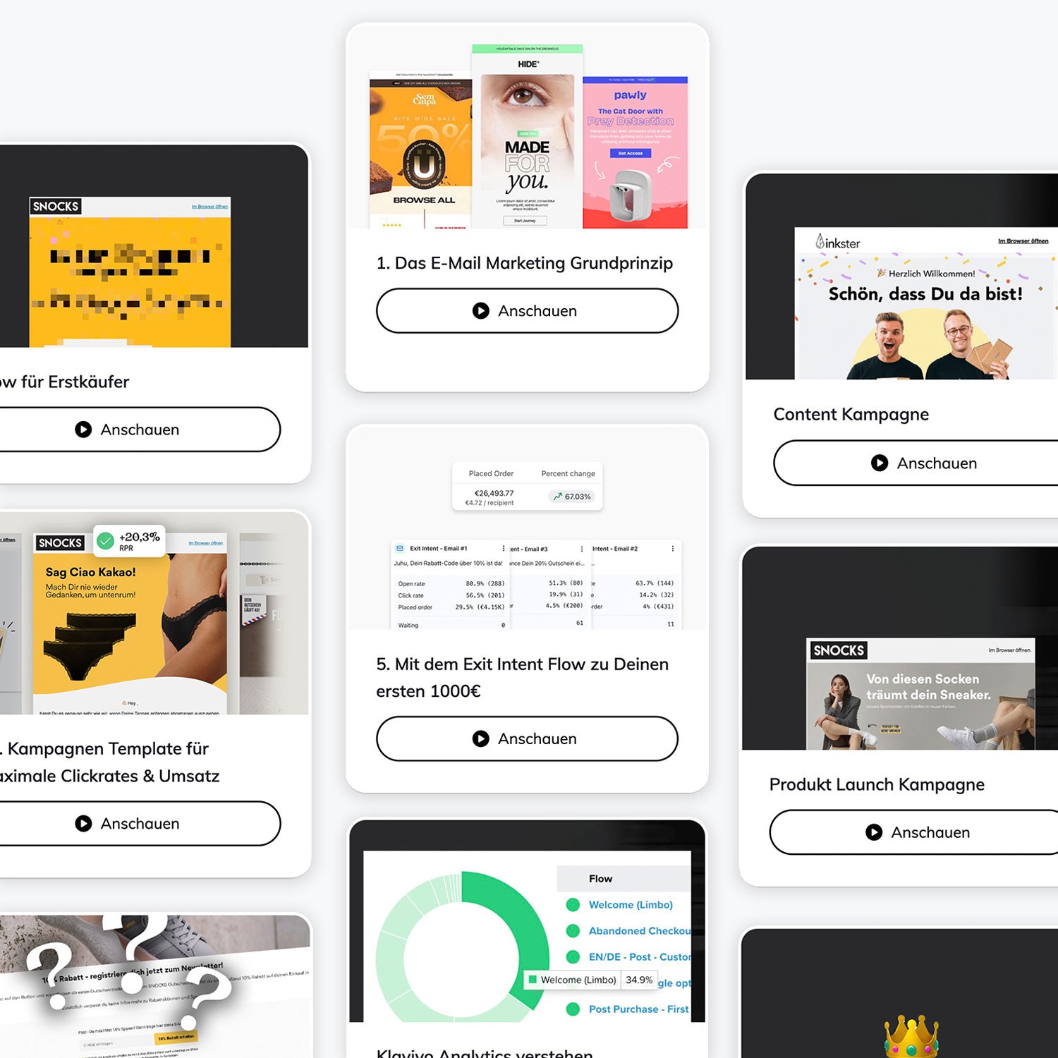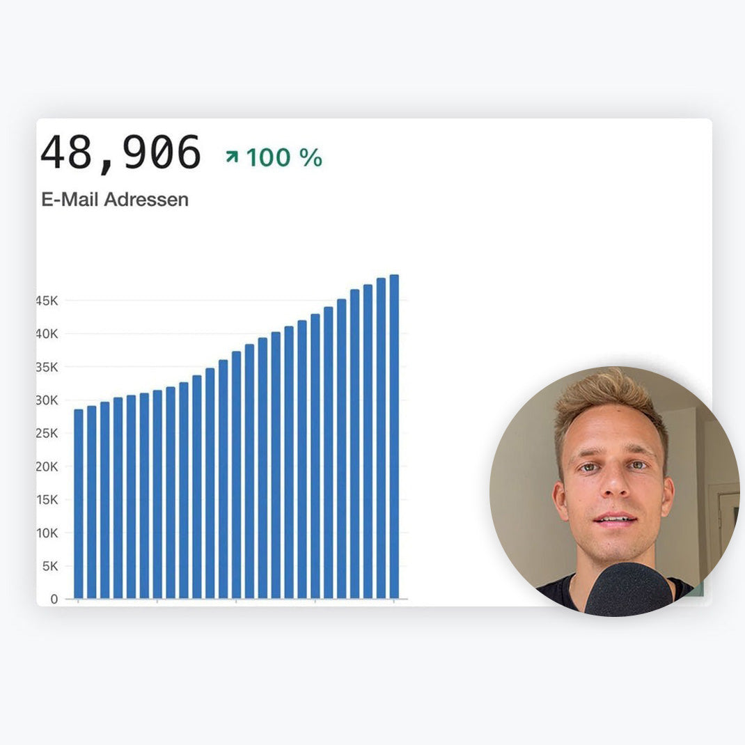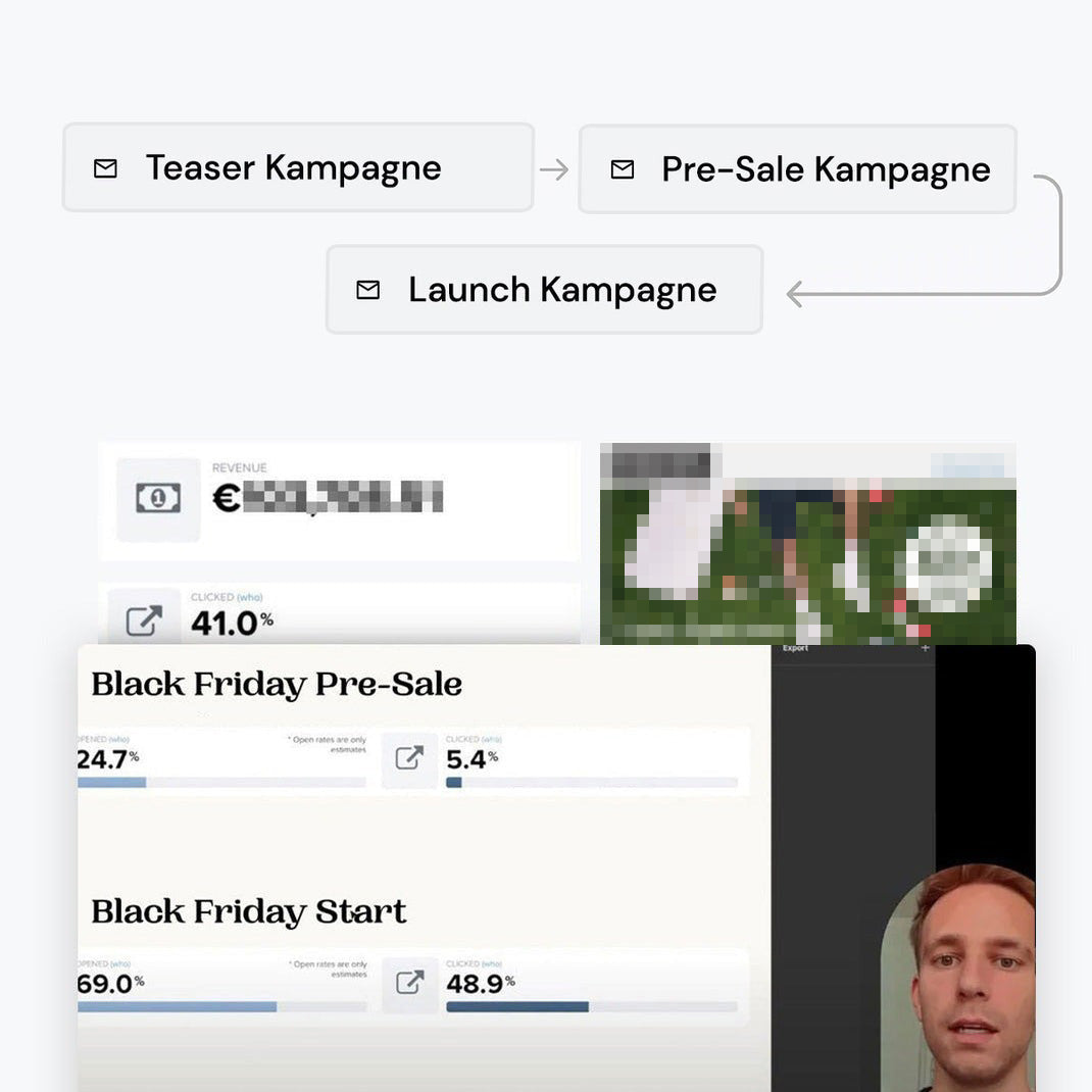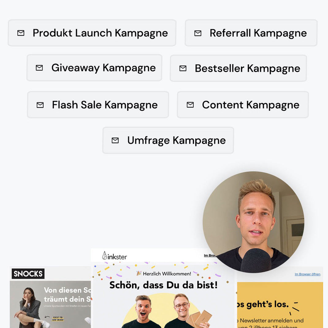 In nur 5 Stunden begleite ich dich dabei, das gesamte E-Mail Setup für E-Commerce Unternehmen aufzubauen. Die Flows, Kampagnen & E-Mails basieren auf dem Setup, das ich für Marken wie Snocks, Inkster oder Störtebekker nutze.