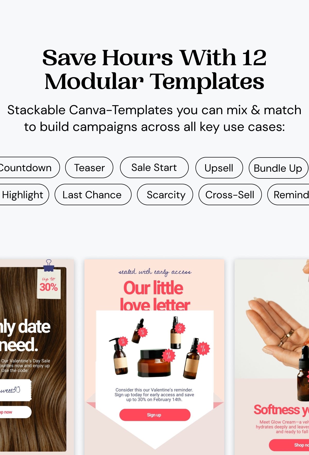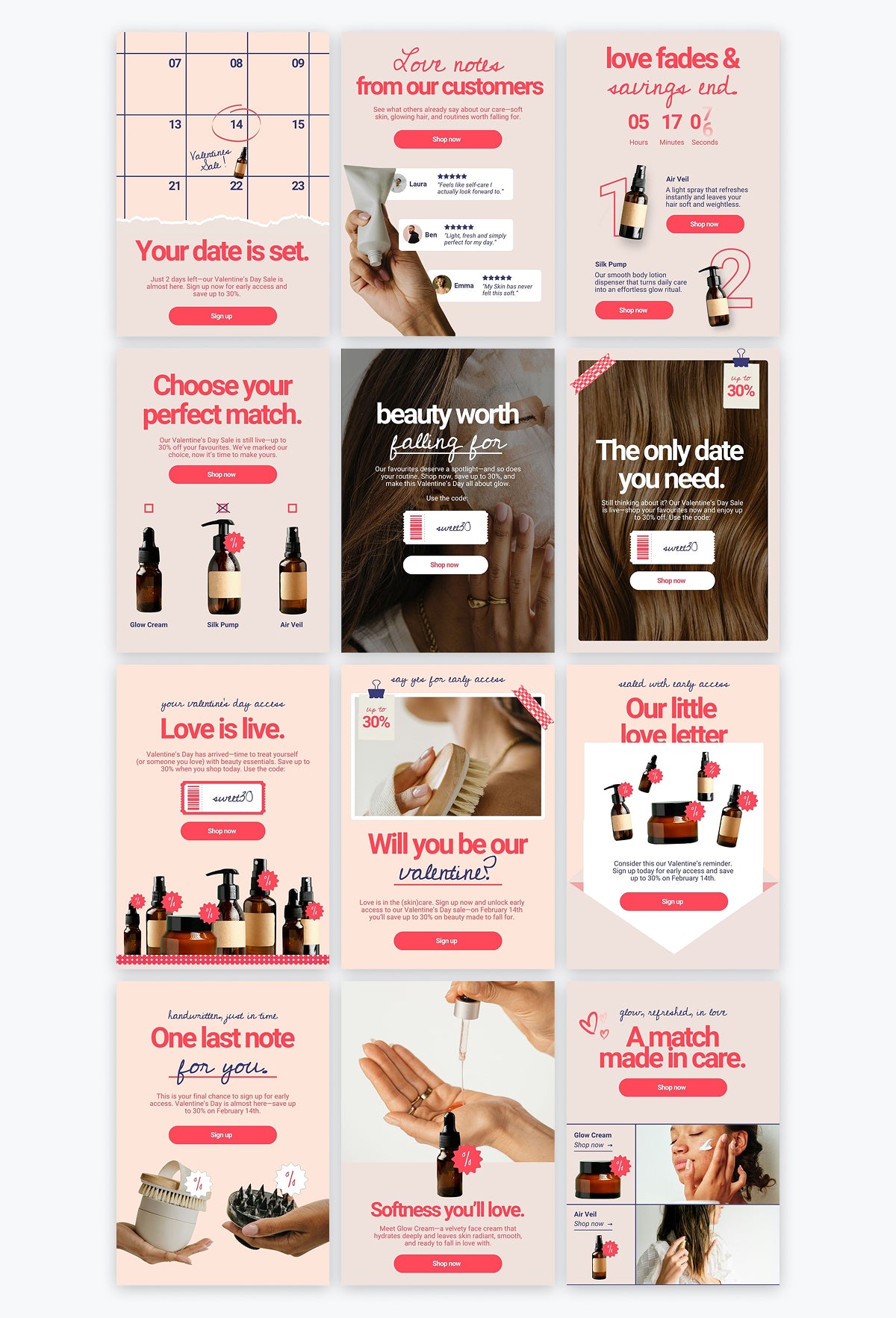 Absolut. Die Templates sind vollständig in Canva editierbar, sodass du sie ganz einfach auf dein Branding abstimmen kannst. Viele Marken nutzen sie sogar als Grundlage für ihre eigenen, individuell gebrandeten E-Mail-Designs.